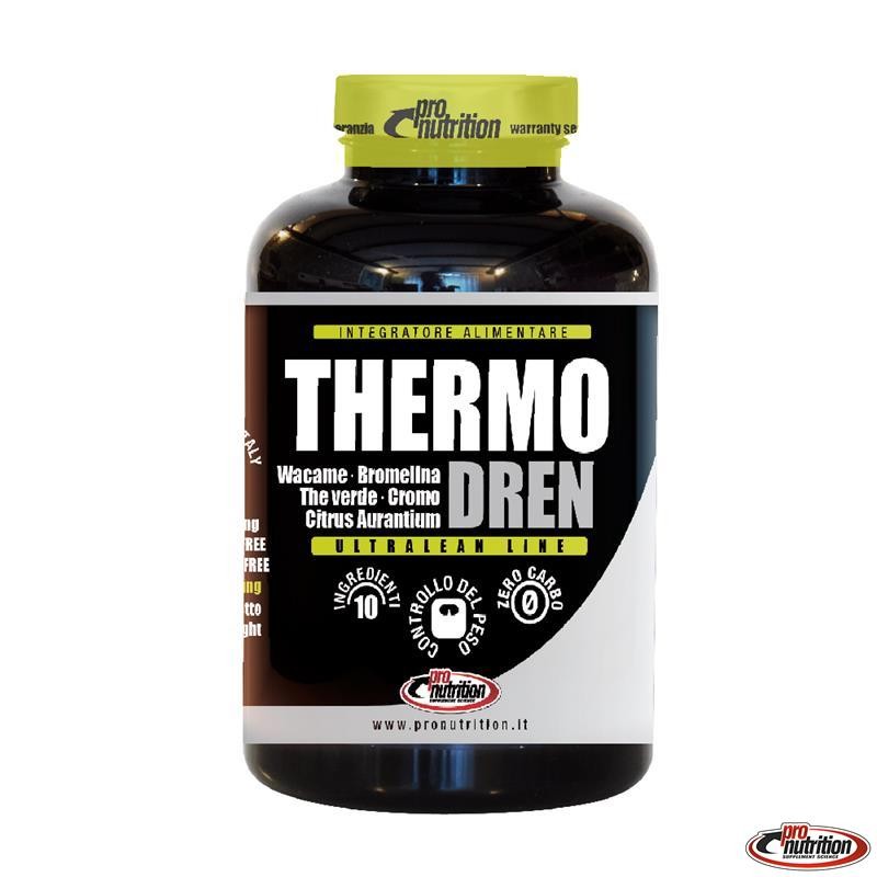 Integratore alimentare sicuro ed efficace studiato appositamente per le donne per ottimizzare i risultati durante le diete ipocaloriche mirate ad ottenere una riduzione del grasso corporeo e dei liquidi in eccesso. La sua formulazione sfrutta l’azione sinergica di estratti vegetali titolati uniti a composti minerali che fanno di THERMO DREN un termogenico di ultima generazione. Citrus Aurantium: titolato al 6% in sinefrina, la cui presenza favorisce l’ossidazione degli acidi grassi. Te’ verde: azione antiossidante e tonica. Wakame: alga titolata in fucoxantina. La Fucoxantina aiuta l’organismo a metabolizzare naturalmente il grasso, che è generalmente l’ultima risorsa utilizzata dall’organismo per la produzione di energia. Banaba: facilita il catabolismo degli zuccheri. Ananas: efficace per l’azione drenante, lipolitica e diuretica che svolge Fucus Estratto secco: ricco in iodio utile per la sua azione di stimolo sul metabolismo. Guaranà: estratto secco ricco in caffeina ottimo stimolanta lipolitico ed energetico Yerba mate: effetti diuretici, stimolante. Cromo: contribuisce al mantenimento di livelli di glucosio normali nel sangue.