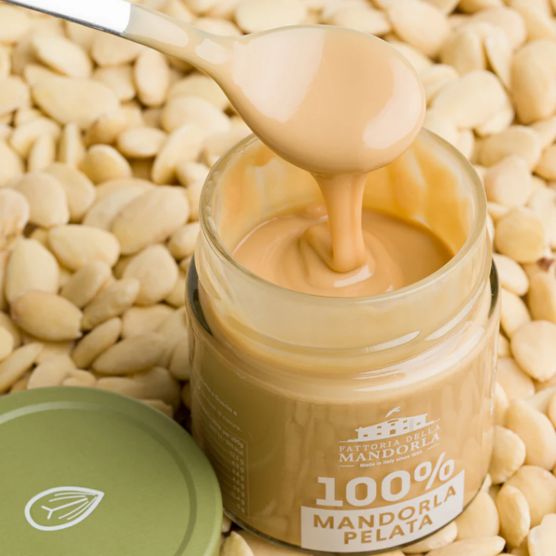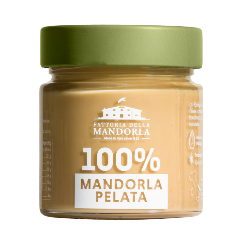 Crema di mandorle pelate 100%, biologica, senza olii, senza zuccheri aggiunti, lavorata a freddo per mantenere intatte le preziose proprietà della mandorla, come la vitamina E, gli acidi grassi buoni e il suo aroma delicato. Perfetta come colazione, nello yogurt, sulle fette di pane o come ingrediente per dolci e ricette sane. Consistenza cremosa e gusto autentico.