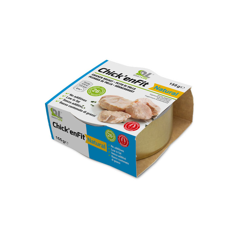 Filetti di petto di pollo al naturale, cotti in scatola, con alto contenuto proteico (26% ), solo 1% di grassi e 0,5% di carboidrati (gusto Natural). La carne viene scelta secondo rigidi criteri, selezionando i tagli magri, unicamente composti dal petto del pollo, che vengono poi accuratamente inseriti in lattine. Una volta riempite, le scatole vengono disposte in un’autoclave, sottoposte ad un processo di sterilizzazione e, successivamente, alla cottura rapida e a pressione. L’acqua contenuta all’interno rappresenta il naturale processo di cottura della carne che, ad alte temperature, rilascia tutti i suoi succhi. Non contiene conservanti o additivi ed è consigliato anche per gli intolleranti al glutine.