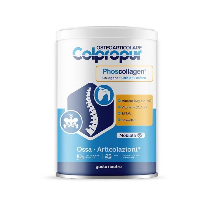 L’azione sull’apparato muscolo-scheletrico di Colpropur OSTEOARTICOLARE si basa principalmente sulle proprietà di un ingrediente esclusivo: il Phoscollagen®, composto da peptidi bioattivi di collagene idrolizzato Colpropur D® e fosfato di calcio, dosati nella corretta proporzione necessaria per mantenere ossa sane.